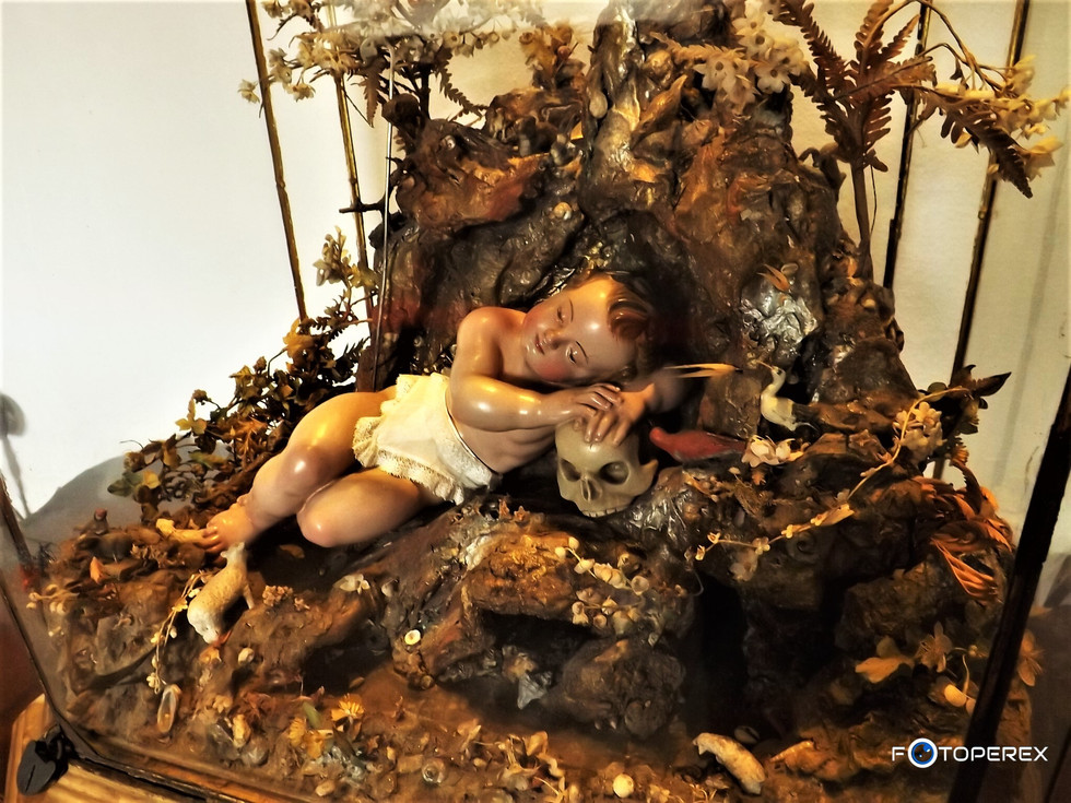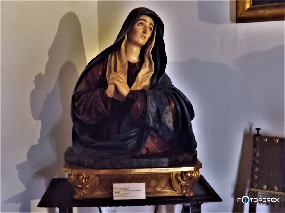 Aureolada de sol, sobre el azul del cielo, tiene reflejos de oro y esmaltes. Iluminada, de noche, es de un efecto sorprendente. Corona al monasterio como una peina sevillana y preside la plazuela que le da entrada.
